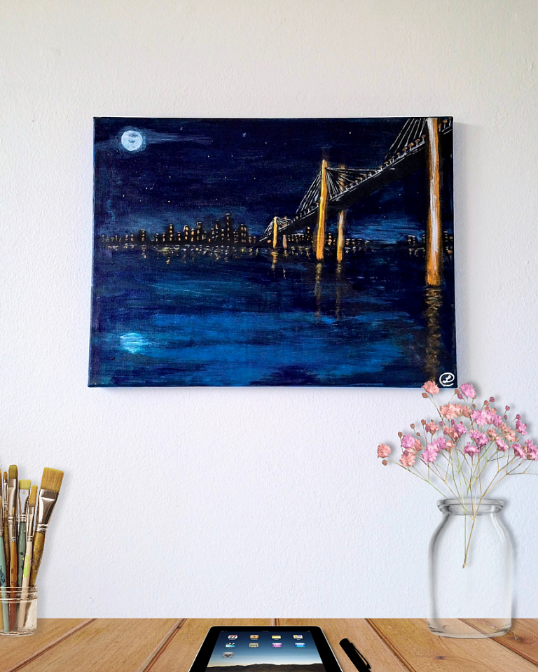 This painting is inspired on the Øresund bridge which connects Sweden and Danmark. It's not a faithful representation; I was simply inspired by this and the illuminated central pillars. A bridge connecting two countries that were historically enemies, and which today are instead connected by an illuminated bridge. I believe we need more illuminated bridges between nations and between peoples.
