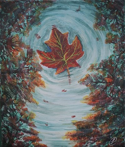 A leaf falls into a puddle, leaving all the others still clinging to the trees.
